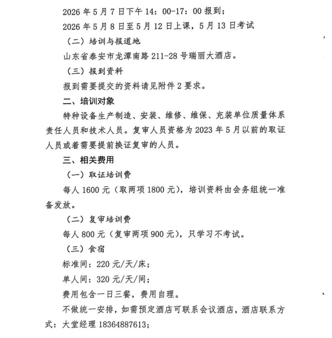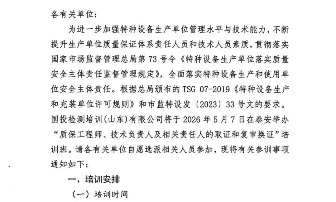 关于举办2026年第一期质保工程师、技术负责人及相关责任人的取证和复审培训班的通知