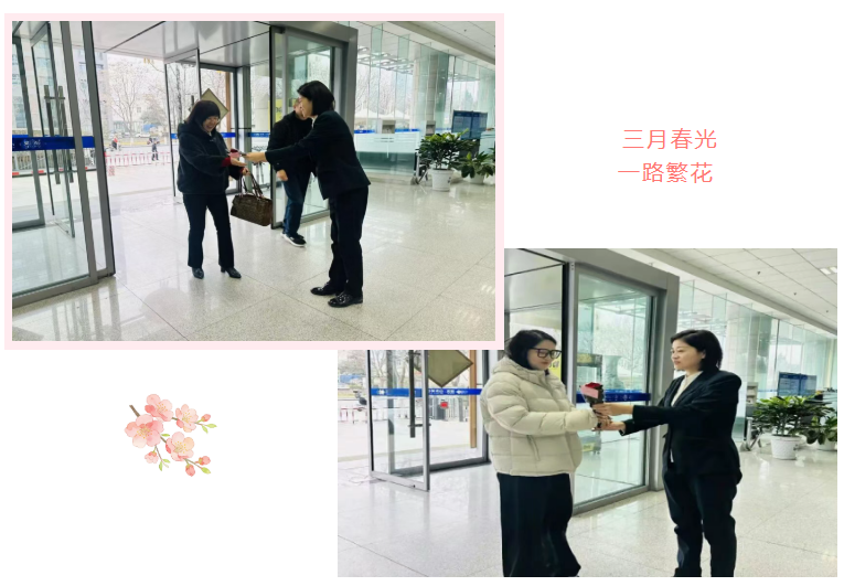 省院公司办公室联合物业公司在办公楼入口处设立“暖心驿站”,为每一位女职工送上芬芳馥郁的红色康乃馨。鲜花映笑颜,温情满职场,娇艳的花朵与明媚的笑脸交相辉映,共同烘托出温馨祥和的节日氛围。这份满载敬意与祝福的“春日惊喜”,传递着组织对女职工辛勤付出的充分肯定,让大家在惊喜与感动中倍添归属感与幸福感,为节日拉开了温馨美好的序幕。